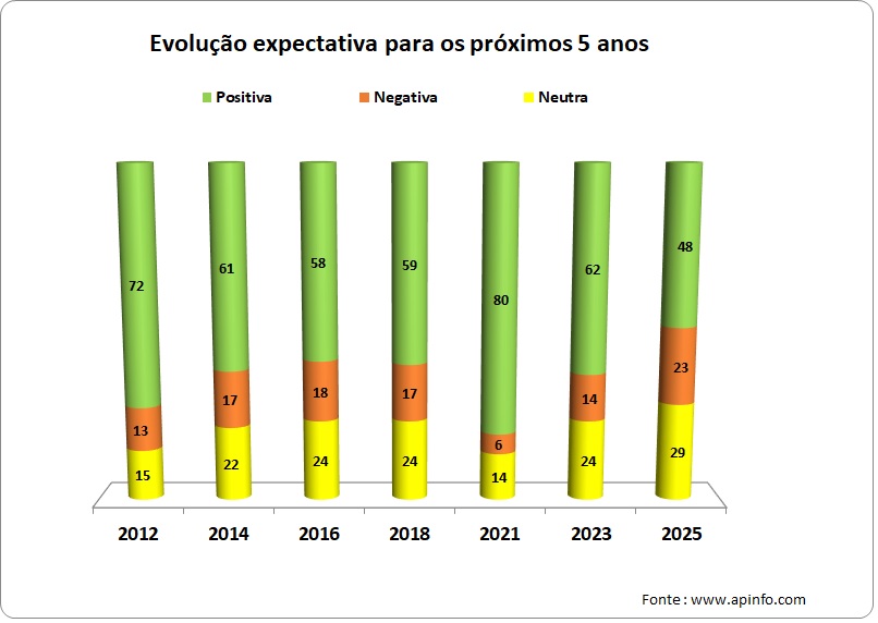 Obs :A expectativa positiva, que chegou a 80% dos profissionais em 2021, passou para 48% em 2025.